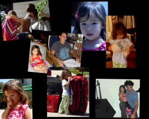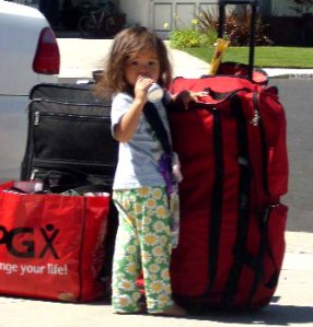 To end this post I am going to put one of my all time favorite pictures of Eve. It is with my luggage as we were getting ready for the trip north. She looks so taken aback when I came to take a picture of her by my stuff at the car. She is still in her pjs and looks so guilty. She isn’t guilty of anything but caring about me. She has gone into their cabinets and got out some V8 juice < which I like a lot> and goldfish and was unzipping my luggage to put them in as a gift. It made me feel soooooooooooo great!!
