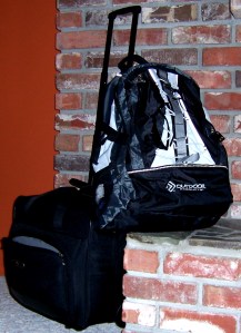 I pull behind me the carry-on (or lift when needed by the Velcro handle) with most of my clothes, the electrical plugs and toiletries inside. Then in the backpack I have a set of clothes, a spare pair of shoes, my netbook, camera, iPod, phone and beach reading. Plus it has a place for wallet and ID in the front pouch. When I am on the go I usually put the backpack on top of the carry on and secure it to the pull bar and just use the wheels.